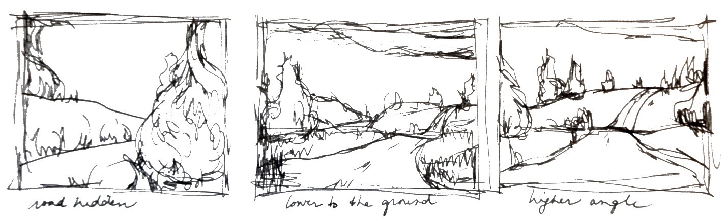 This picture is a set of three thumbnail sketches I drew to work out a composition focused on a road. In these sketches, I was attempting to determine the most pleasing eye-level, and the position of the road on the canvas (should it be traveling into the distance, or disappearing around a visual obstruction?).